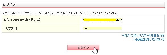 そうすると「ログインID(メールアドレス)」と「パスワード」を入力するページに移るので会員登録した際の情報を記入します。