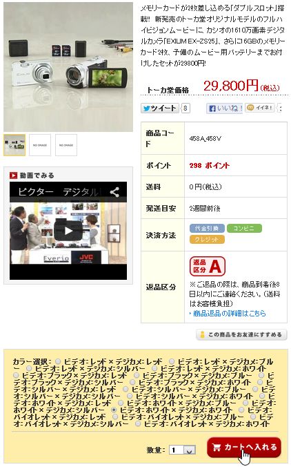 『Everio GZ-HM33』のページから、ビデオカメラの色とデジカメの色の組み合わせを選択し、「カートへ入れる」ボタンを押します。