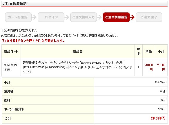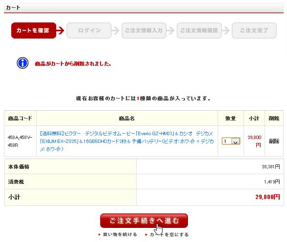 カートに入っている商品が「Everio GZ-HM33」であることを確認し、「ご注文手続きへ進む」ボタンを押してください。