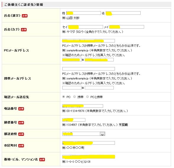 次に名前・メールアドレスや電話番号、住所を入力します。会員登録を行いログインしている場合は、会員登録時に入力した情報が予め記入されます。