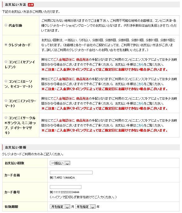 さらに支払方法を指定します。代金引換・クレジットカード・コンビニ支払から選択できます。